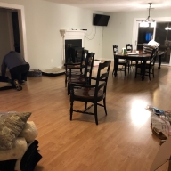However, being a person that hates to impose on anyone, Tim decided to leave the 120″ dining room table and 8 chairs for him and I to break down and move. In the evening prior to the beginning of the renovation, we tackled it. Once we removed the two leaves in the table, Tim and I flipped the enormous and heavy table over on it’s top and unscrewed the legs, removed them and put them in the third bedroom. Then the difficult process of turning the table on its side, with the blanket underneath so it would slide through the opening to the foyer then on through the narrow hallway and to position it in the bedroom so that we could still get into the bedroom, well somewhat. We did it together with very few mumbling sounds under our breath and if there was any it was one was tugging the dining table too quickly through the house and the other one trying to keep the blanket under the table so the floors wouldn’t scratch the table. We didn’t worry about the floors since they were going to be gone in less than a week’s time.