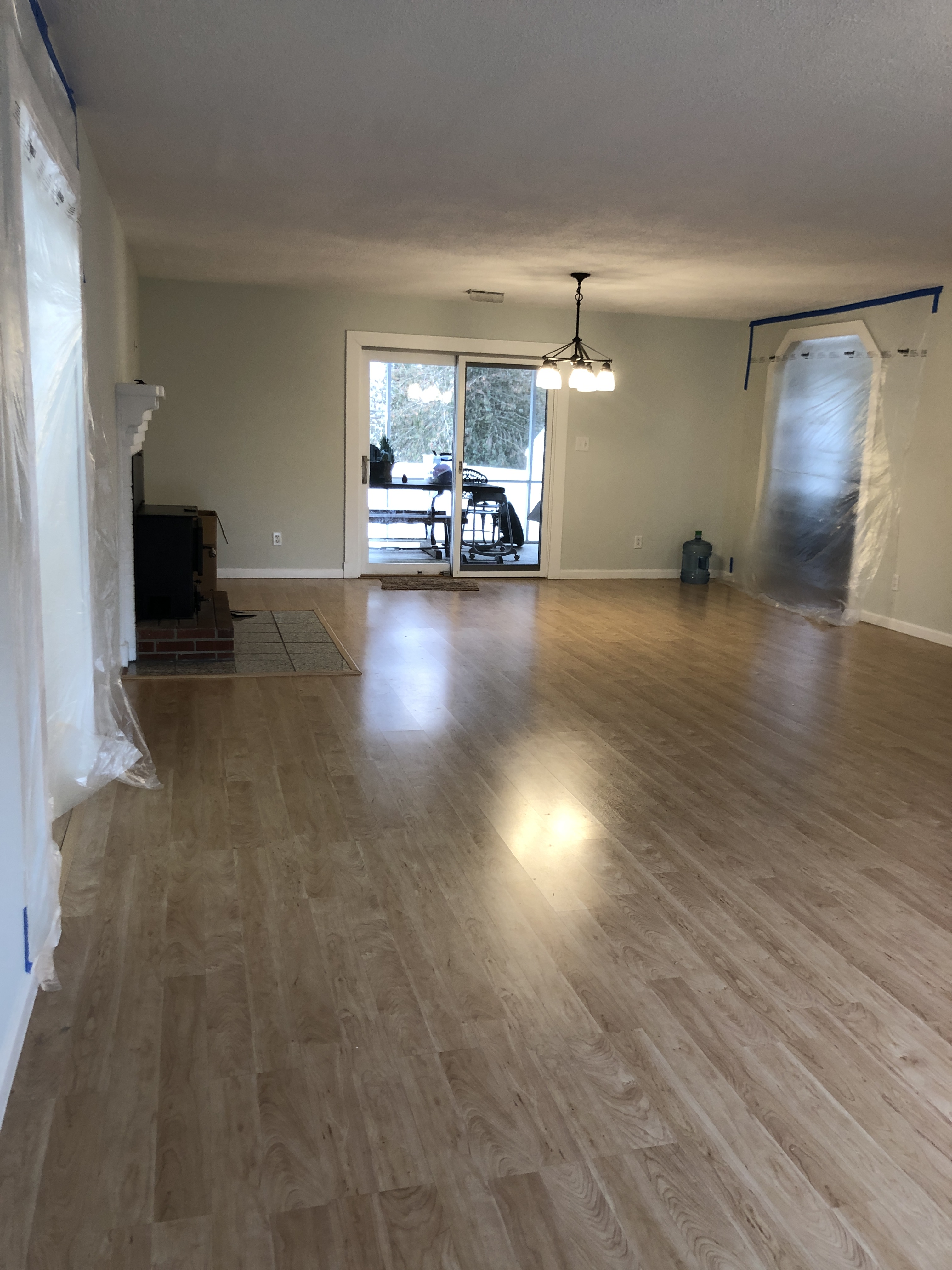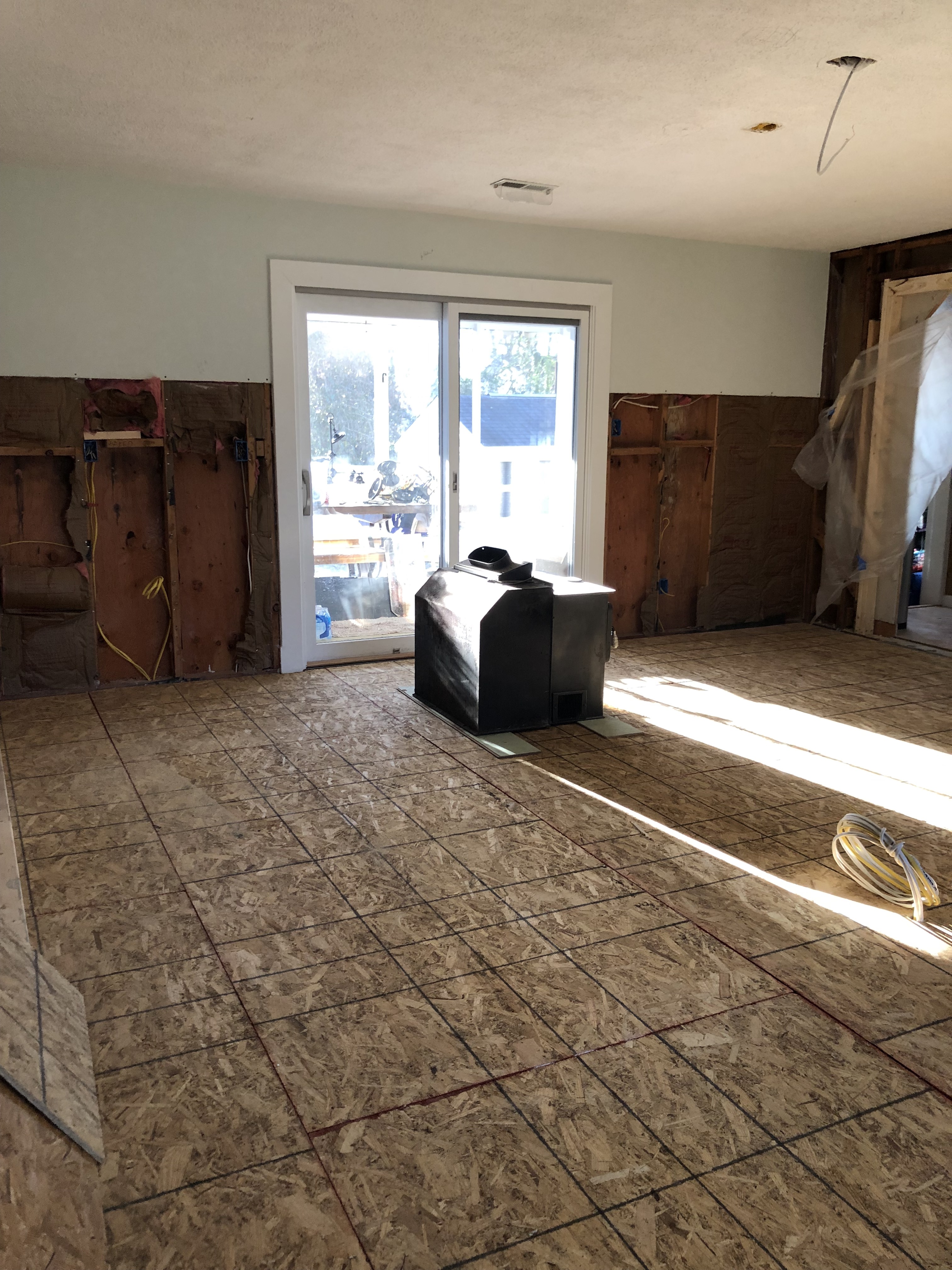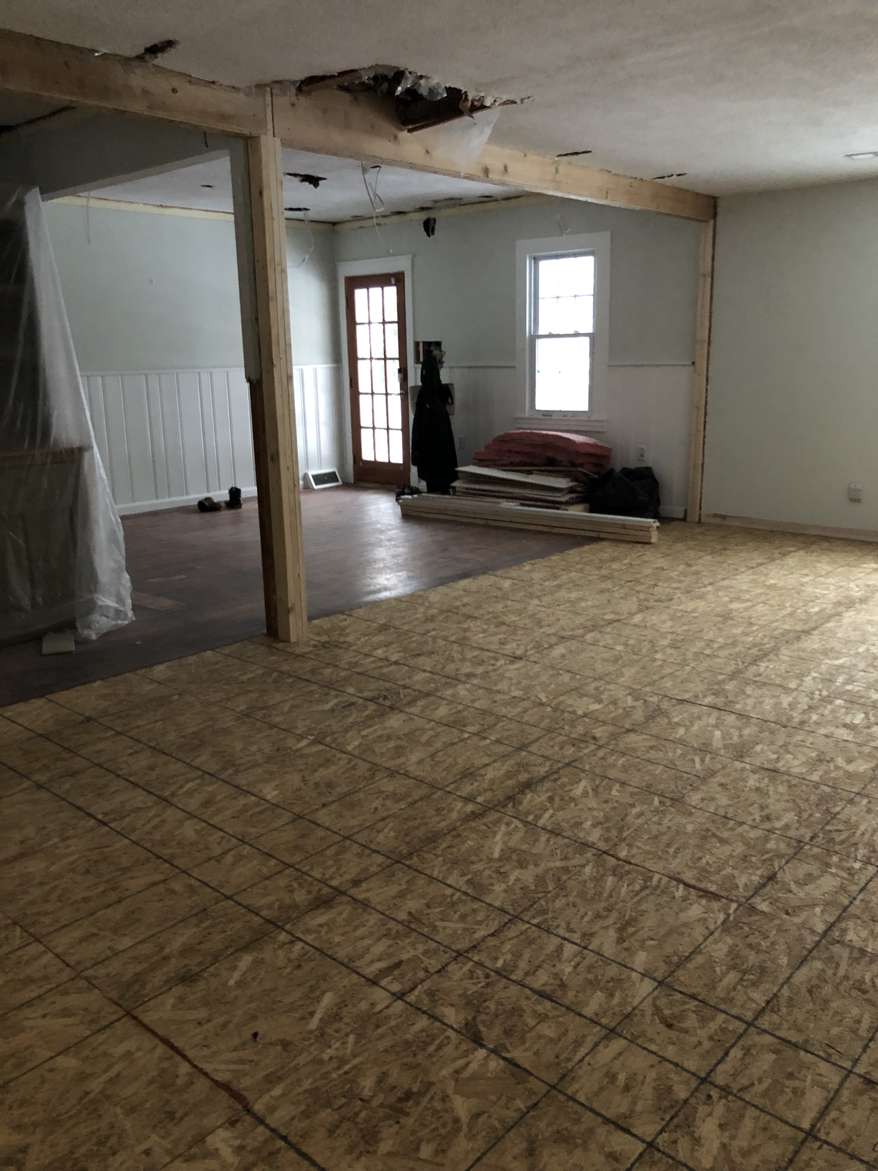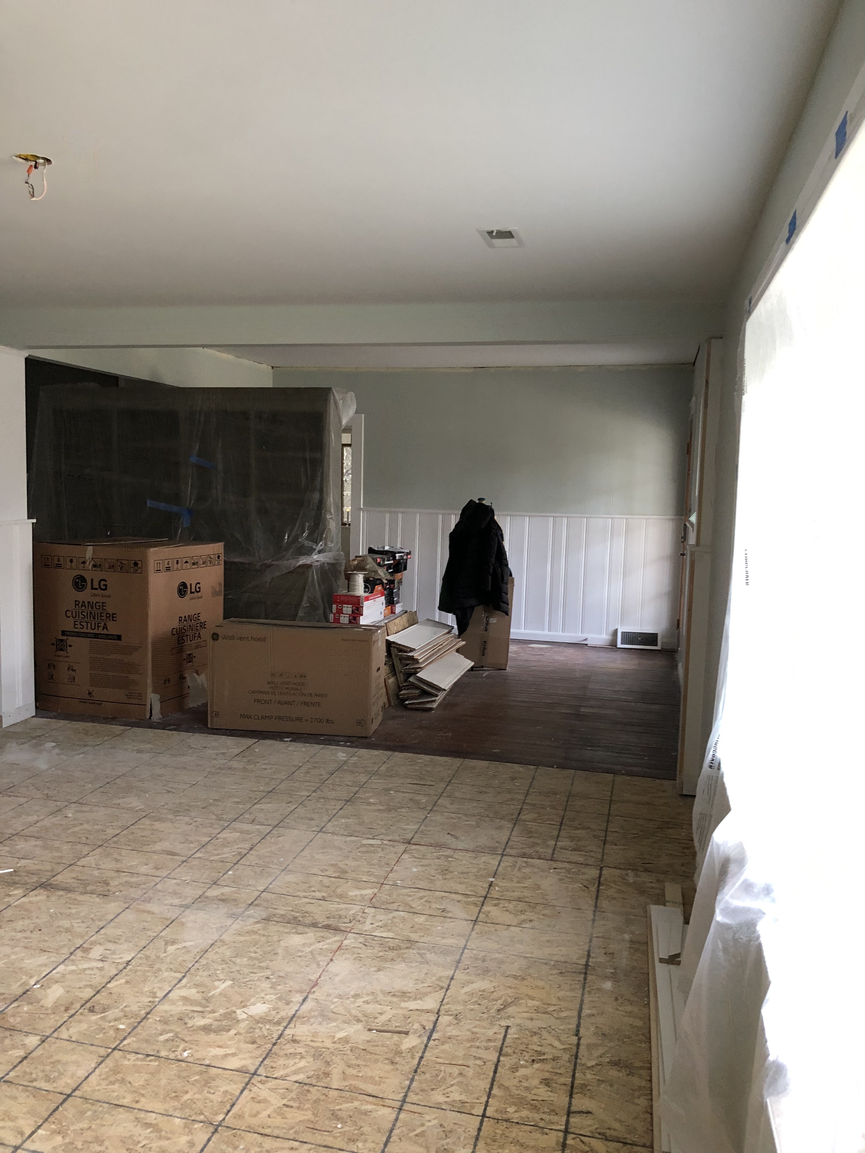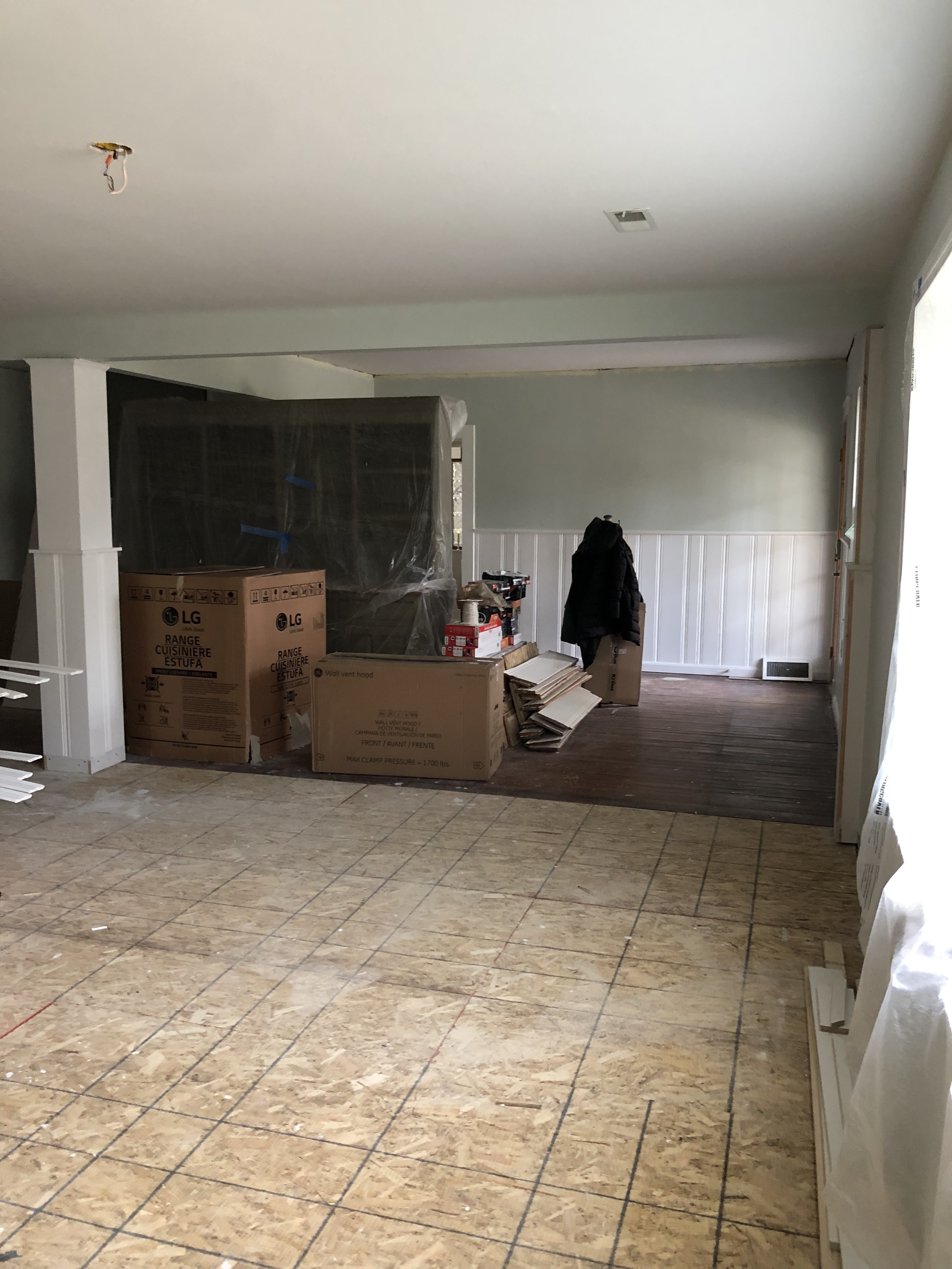 Next, the flooring was ripped up throughout. Under the laminate in the foyer, was Heart Pine which was in gorgeous condition, what was not so gorgeous was what was under the laminate in the dining/living room area. Ugly old whitish vinyl tile with an abstract design. In a perfect world, we would install Heart Pine flooring over the old vinyl tile; however, it proved to be cost prohibitive and difficult to find since it would need to be purchased reclaimed. So Tim and I decided on a waterproof laminate flooring. We think we know what we want to purchase; however, we are still looking.