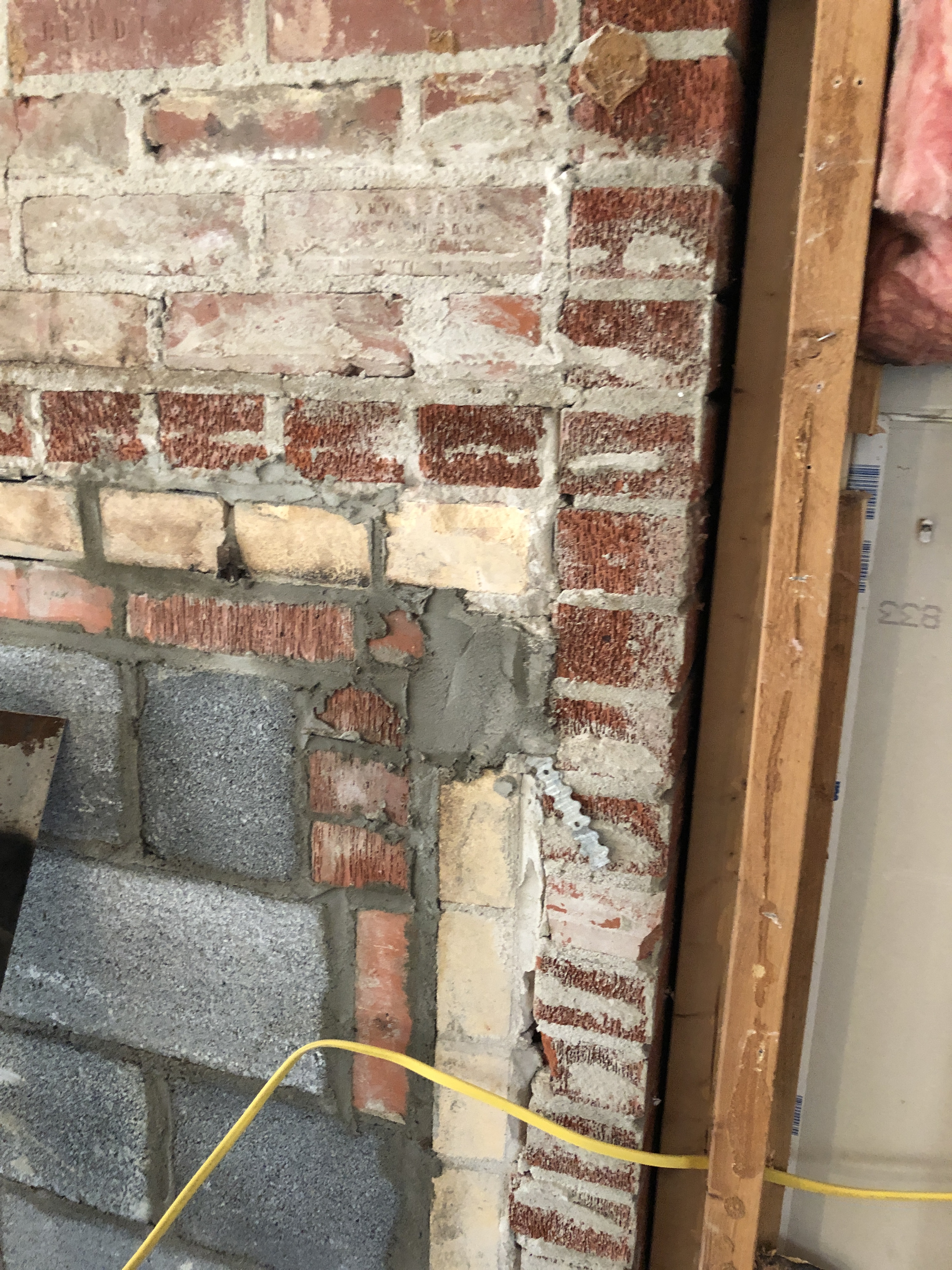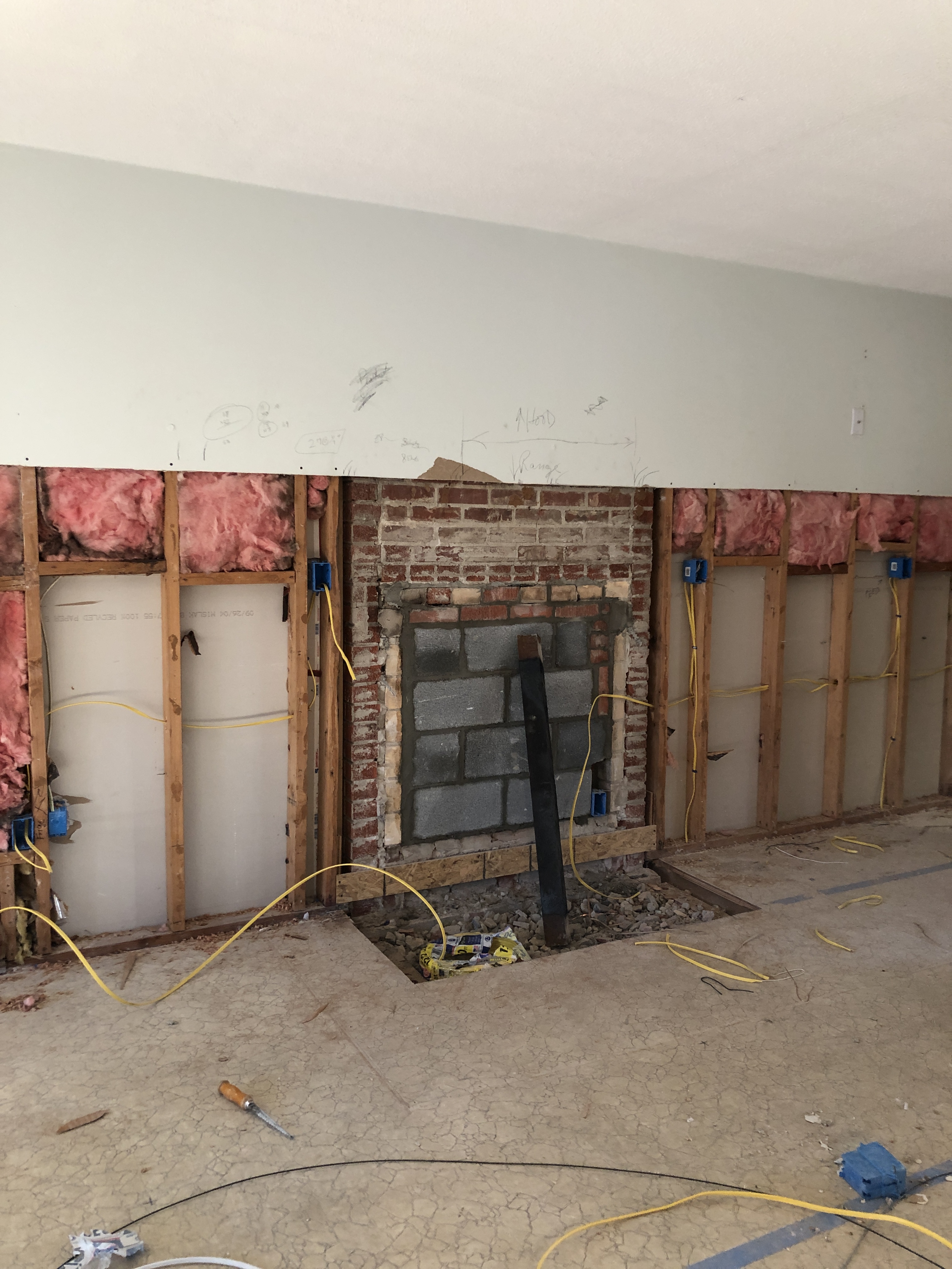 The drywall on the outer perimeter walls were next to be removed. I never knew that they would remove the drywall about half way down and to the floor. I guess it’s for ease to install new wiring and plumbing. Now this enormous room was looking, well bare, except for a brick flu from the original furnace which is still located in the crawl space and the brick and granite tile fireplace. Both had to go… so a mason came by, 3 generations of men, a grandad, father and son worked on removing the flu from the top of the roof to below the floor and the brick surround to the fireplace. The eldest installed cinder block in the fireplace opening since the range will be going in it’s place. It’s great to see that some young people are still interested in the studying and being a mason. Such a great skill, one we desperately need.