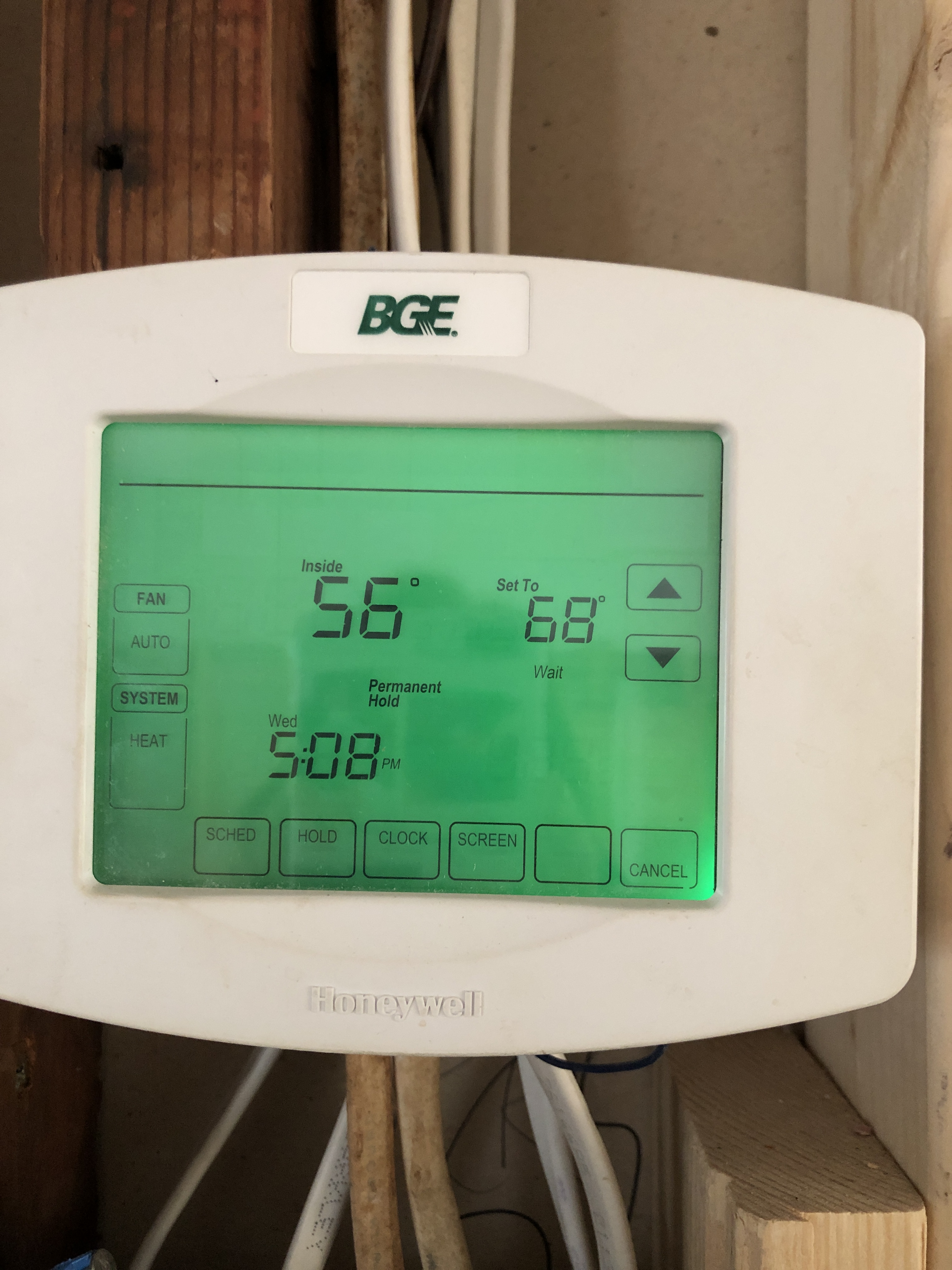 The electricians had installed a new electrical panel that day so hopefully they didn’t miss installing the HVAC into the panel. I reluctantly dialed Bryan’s number, he picked up and he said he would check with Dave, the electrician, and get back to me. He gave me the direction to not touch the breakers in the panel. And I didn’t. When it comes to electricity, this lady was not going against anyone’s orders. I waited patiently for Bryan’s return call which was very quick. He said that they had turned off the HVAC when they were labeling the new panel. Dave couldn’t hear the other electrician, James, over the sound of the furnace. So it was a quick fix, go to the panel and switch over the breakers to the furnace. All was right with the world. Warmth. Or so I thought. See, I grew up with and have always had a gas furnace. It’s an instantaneous thing, turn the furnace on, it’s on and warm air comes flowing in within minutes. Well, who knew that there was a delay between turning the breakers on for the HVAC and it actually pumping out warm air. I went over to the thermostat and there it was, it was on! Hurray for me. However, I didn’t hear it kick in and when I further studied the thermostat display I noticed something a little quirky – the word “wait” under my desired temperature, then I noticed the current temperature displayed a cool 56 degrees. Yes, even for me it was getting a little too cool. So I waited, like the display said. After about 5 long minutes, I started feeling a panic settling over me and made that dreaded call. Thinking to myself, how could I bother Bryan once and now I have to call him again, so unlike me.